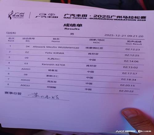 南都訊 記者汪雅云 12月21日7時,2025廣州馬拉松賽激情開跑。最終,來自埃塞俄比亞的選手阿費沃克·梅斯芬·沃爾德騰薩耶以2小時12分23秒的成績奪得男子組冠軍。而來自埃塞俄比亞的喬伊斯?切普凱莫伊以2小時22分40秒的成績奪得女子組冠軍。